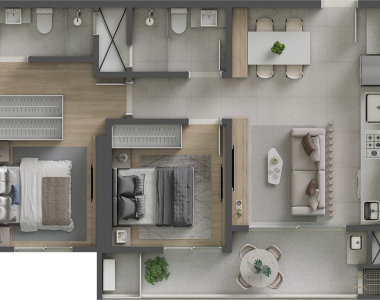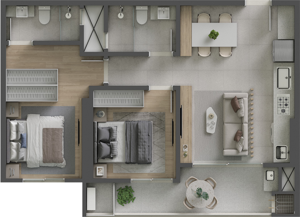 Apartamentos pensados para diferentes estilos de vida, com ambientes integrados e sacadas com vista privilegiada da região.